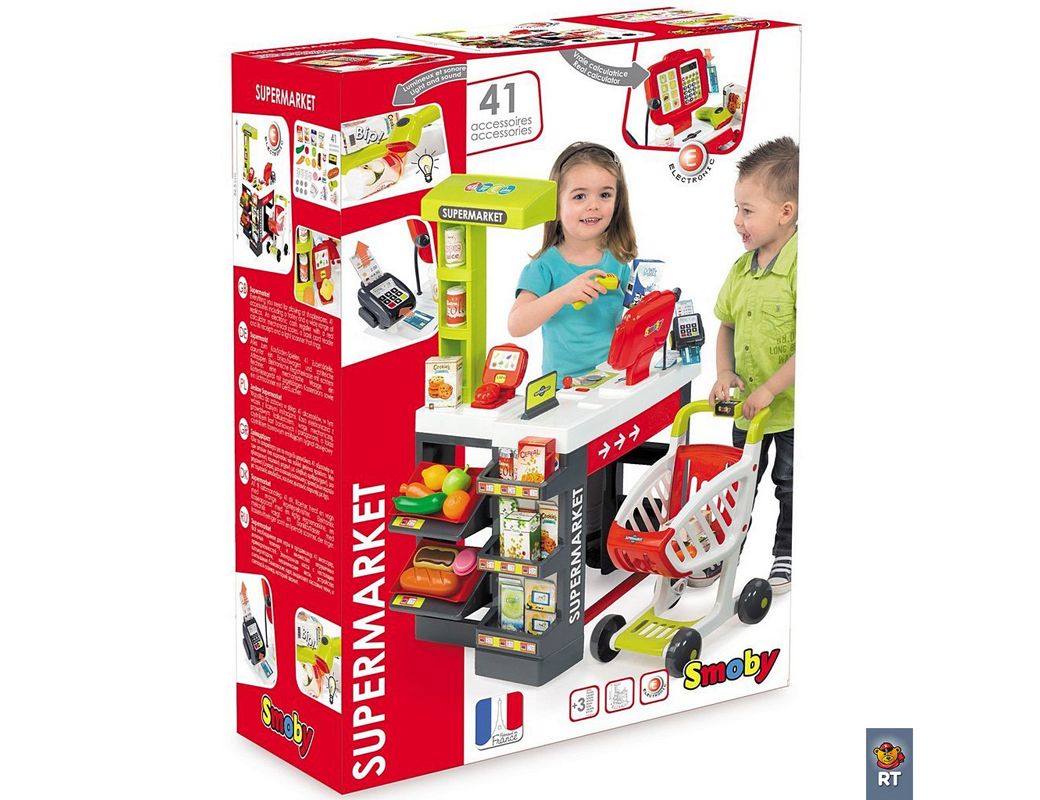 Для детей от 3-х лет Игровой интерактивный торговый центр принесет много радости и ярких впечатлений Вашему ребенку! В процессе игры малыш может примерить на себя роли продавца и покупателя. Набор Супермаркет с тележкой Smoby оснащен всем необходимым для увлекательной сюжетной игры, он очень реалистичен и функционален. В магазине множество полочек и лоточков с коробочками, баночками и муляжами продуктов. На прилавке располагается кассовый аппарат со звуковыми и световыми эффектами, внизу - встроенный ящичек для денег, открывающийся специальным ключом. Касса функционирует как калькулятор, может рассчитывать сумму покупок, которая отражается на дисплее. Рабочее место продавца оборудовано сканером для считывания штрих-кодов, весами, микрофоном и терминалом для пластиковых карт. Тележка для продуктов, как в настоящем магазине - чтобы ею воспользоваться, в ручку нужно вставить монетку. У покупателя для расчета за покупки есть кредитная карта, а также достаточное количество денежных купюр и монет. Играя в «Супермаркет», дети в воображаемых обстоятельствах воспроизводят поведение взрослых и познают правила общения между продавцом и покупателем, учатся делать покупки и рассчитывать свои траты, быть практичными и бережливыми. Набор «Супермаркет с тележкой» Smoby настолько интересен и многофункционален, что ваш ребенок с большим удовольствием будет играть с ним самостоятельно или вместе с друзьями. В комплекте: электронная касса, ключ, сканер, весы, тележка для покупок, терминал для кредитных карт, пластиковая карта, микрофон, ящик для денег, стойка с полочками, 4 чека, 12 купюр, 6 монет, кабачок, морковь, помидор, лимон, апельсин, яблоко, эклер, батон, пирожное, 4 фасовочные коробочки, 2 баночки с напитками. Требуются пальчиковые батарейки: 3 х АА/1,5V. Приобретаются отдельно. Размер игрушки: 53,8х45,8х86,5 см Вес: 4 кг Производство: SMOBY. Сделано во Франции.