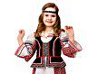 Замечательный Национальный костюм пригодится для задорных танцев, театральных выступлений или на любых костюмированных мероприятиях. Белая блузка с красно-черной вышивкой, удлиненная красная юбка с белым фартуком и черная жилетка выполнены из качественного текстиля. Сделает образ законченным повязка на голову с повторяющимся узором.