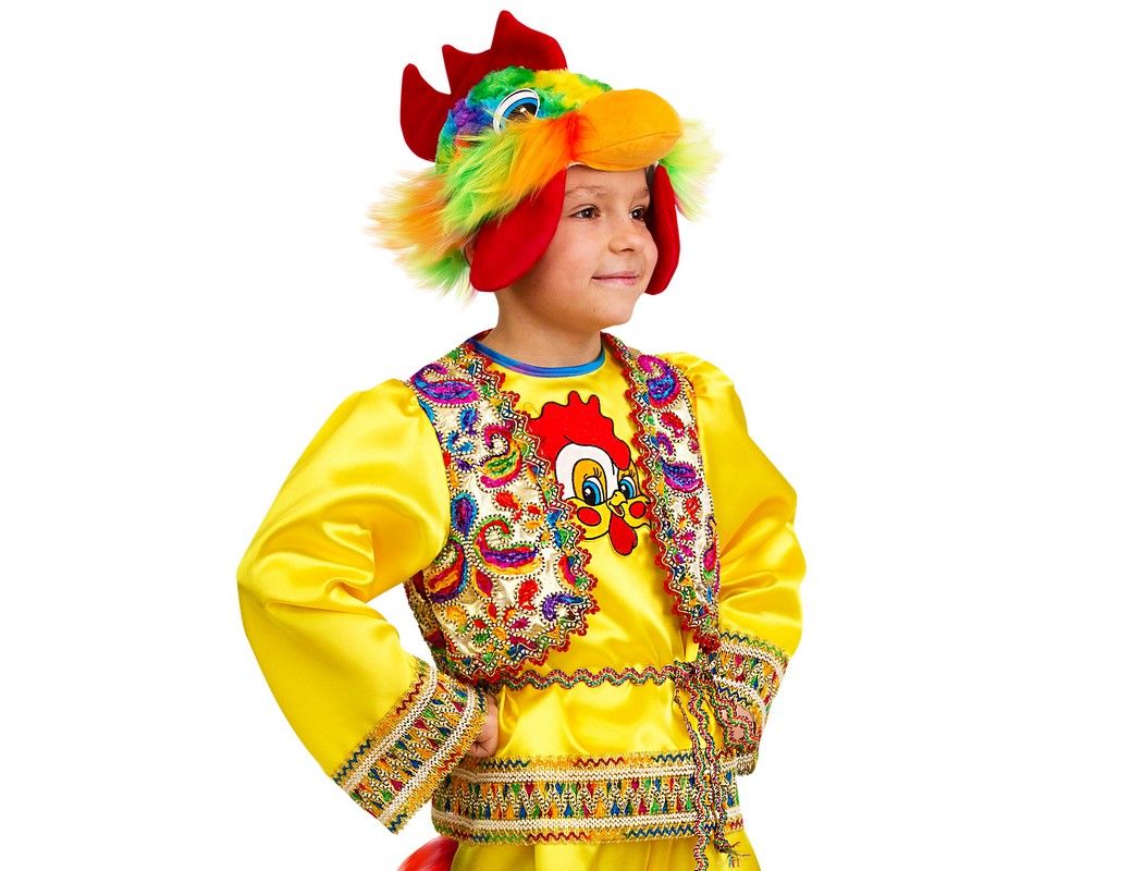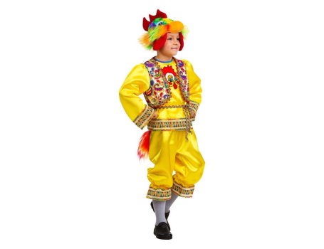 Красивый, пестрый персонаж Петушок, без него не обходится ни одной постановки и ни одной сказки. Данный костюм выполнен из качественного текстиля. Основной цвет наряда желтый, жилет и окантовка выполнены разноцветной росписью. В таком виде ваш ребенок будет самым ярким персонажем на любом празднике.